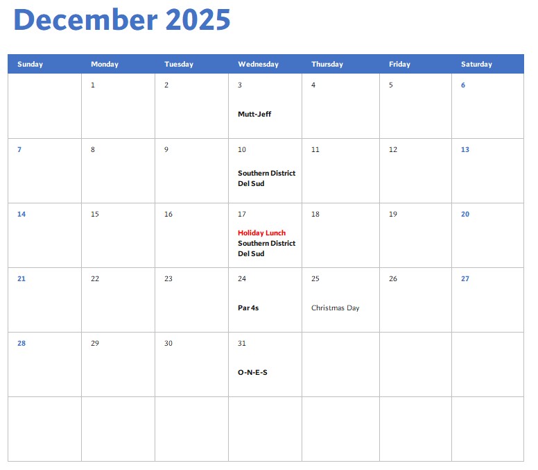 Each week we add interest by adding games to our league play. Top 2 players in Flight #1, #2, and #3 will receive points. Here is the calendar of weekly events for 2025-26: